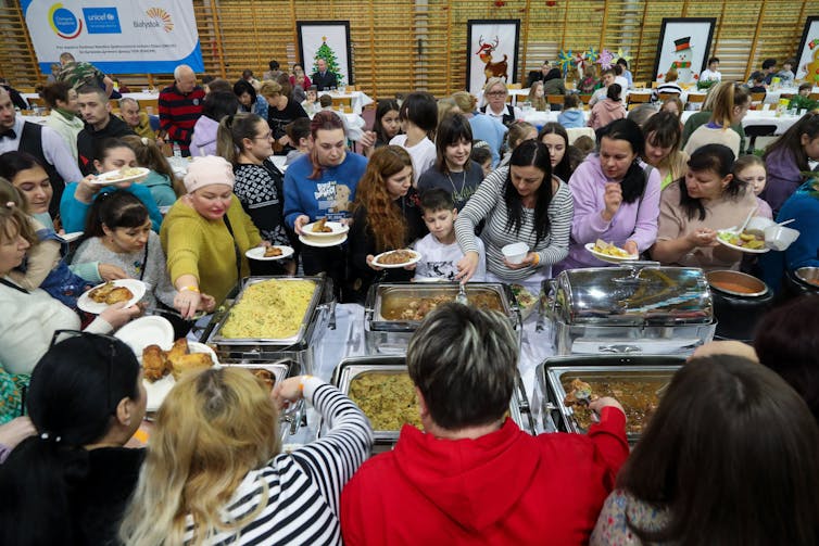 A Christmas feast for refugees at a high school in Bialystok, Poland, in January 2023. Artur Reszko/PAP/EPA