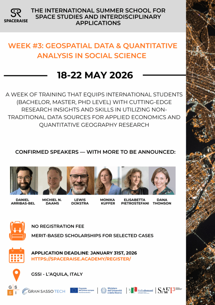 The Gran Sasso Science Institute is organising SPACERAISE, an international summer school designed to equip international students (Bachelor, Master, and PhD levels) with theoretical insights and practical skills for working with non-traditional and geospatial observational data in applied economics and quantitative geography.
