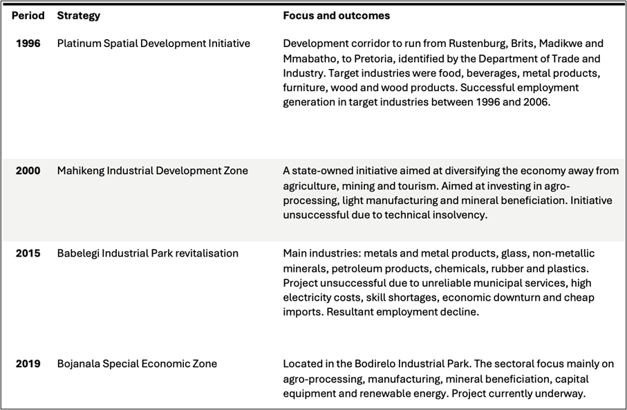 Economic diversification involves shifting away from a dominant sector to cultivate multiple industries that generate diverse income streams. Relying heavily on a single resource sector increases an economy’s vulnerability to the global commodity market and amplifies the risk of unemployment. South Africa’s North West Province is bordered by Botswana, Limpopo, the Free State, and the Northern Cape and consists of four district municipalities: Bojanala, Ngaka Modiri Molema, Dr. Ruth Segomotsi Mompati, and Dr. Kenneth Kaunda. These areas have experienced a significant out-migration to Gauteng since 1996, due to limited economic opportunities beyond the mineral sector. The North West Province initially developed as an agro-pastoral economy in the 1840s, with a focus on crop cultivation and livestock farming. However, the discovery of mineral deposits during the mid-1880s altered the economic base and heightened British interests. Since then, mining and agriculture have become the province’s economic foundations, with agricultural activities including maize, sunflower, and cattle farming, as well as the mining of platinum, gold, diamonds, granite, marble, and fluorite (DBSA, 2000).