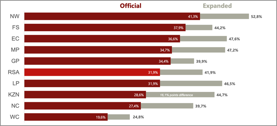 Looking a little deeper and beyond GDP contribution, the province’s official unemployment rate has steadily risen from 23.5% in 2013 to 34.8% in 2023, in comparison to the economically diverse provinces of Gauteng, KwaZulu-Natal, and the Western Cape, which reported the highest increase in employment. The 2024 quarterly report (Figure 3) confirms this trend, reporting that the North West Province recorded South Africa’s highest official and expanded unemployment rates at 41.3% and 52.3%, respectively (Statistics South Africa, 2025).