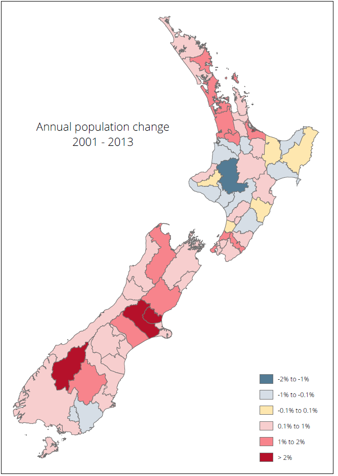 Figure 3: New Zealand: Annualised population change according to local authority areas: 2001-2013