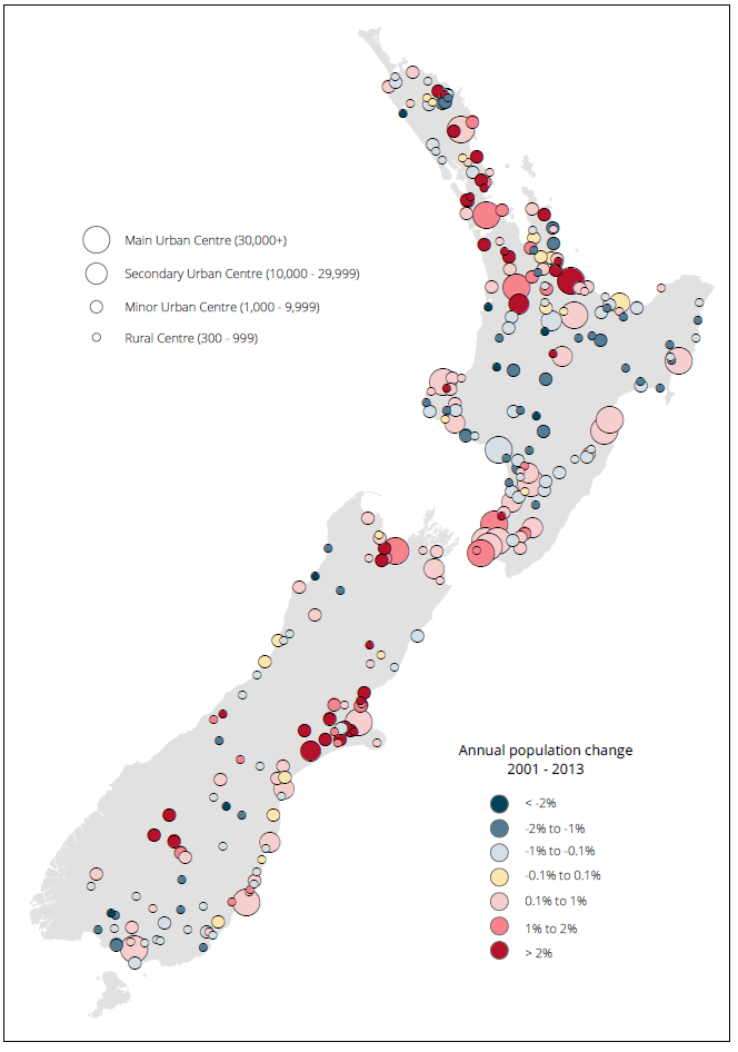 Figure 4: New Zealand: Annualised population change in the Urban Centres: 2001-2013.