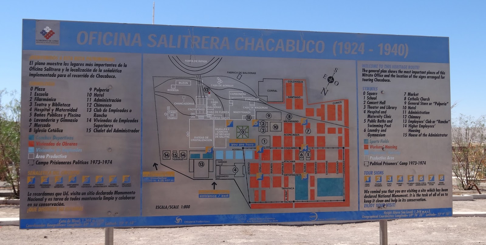While in Antofagasta, we went on a trip to a former mining town in the Atacama Desert called Chacabuco. Founded in the 1920s, this former nitrate town was set up by the Anglo Nitrate Company to provide all its workers needed. It was noticeable at the time for its size, production capacity and the quality of housing. The town had its own currency and all facilities were run by the company, a clever way to keep the money ‘in house’. There was a hospital, library, hotel and even a theater offering distractions from the daily grind such as performances by international stars like Enrico Caruso.